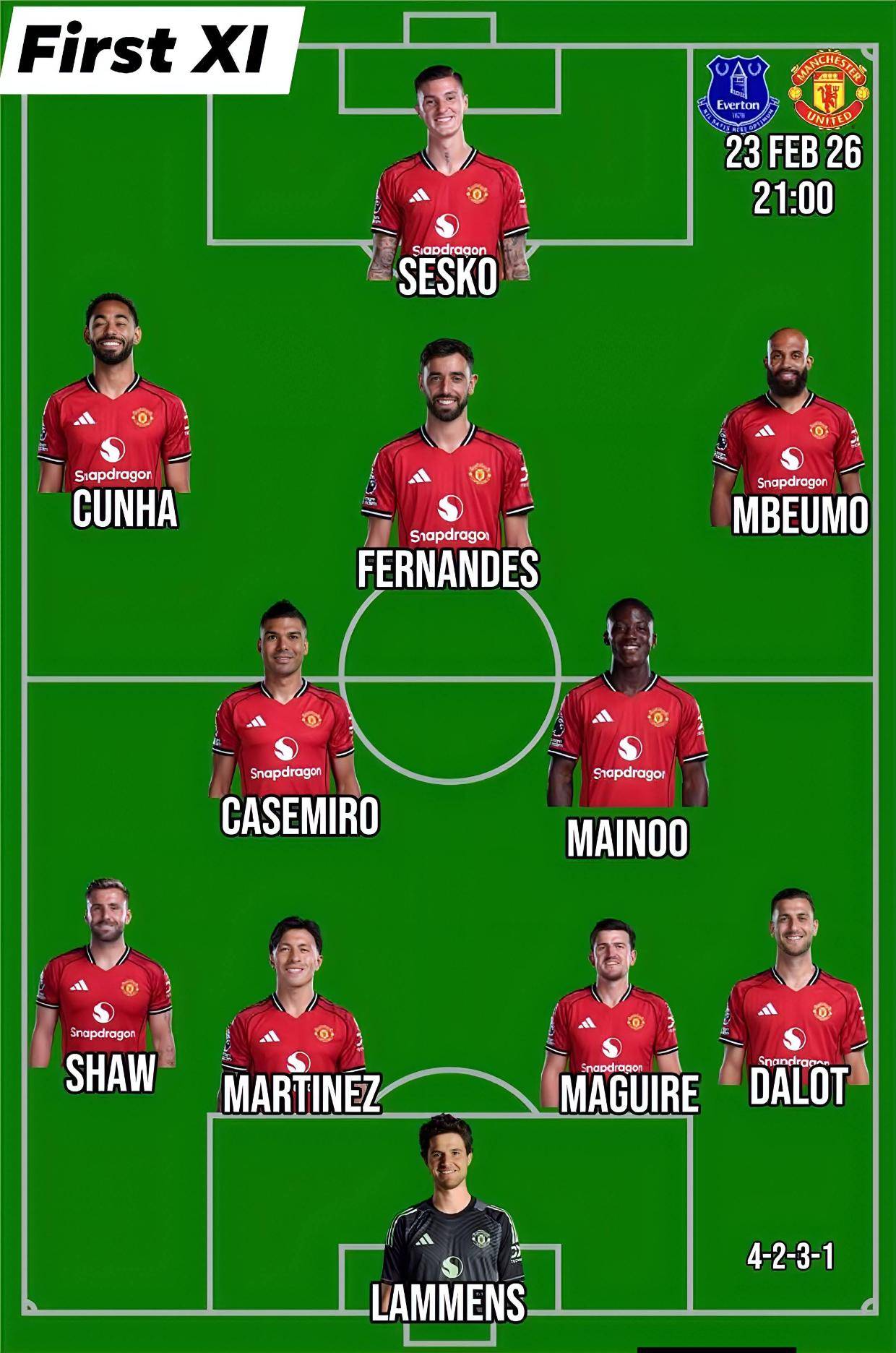 例如,《曼彻斯特世界报》预测的曼联首发就是:塞纳·拉门斯/迪奥古·达洛,马奎尔,利桑德罗·马丁内斯,卢克·肖/科比·梅诺,卡塞米罗/姆贝莫,B费,阿马德/谢什科。